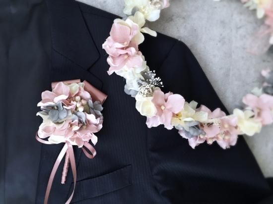 モーヴピンクの花冠&リストレット&ブートニア3点セット