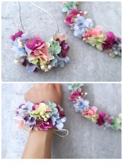 パステルトーンをカラフルに使いながら、アクセントにパープルを加えた花冠&リストレットの2点セットになります。