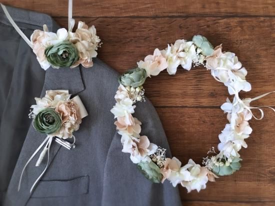 グレイッシュなグリーンのラナンキュラスに、オフホワイトとベージュでまとめたナチュラルな花冠&リストレット&ブートニアの3点セットになります。