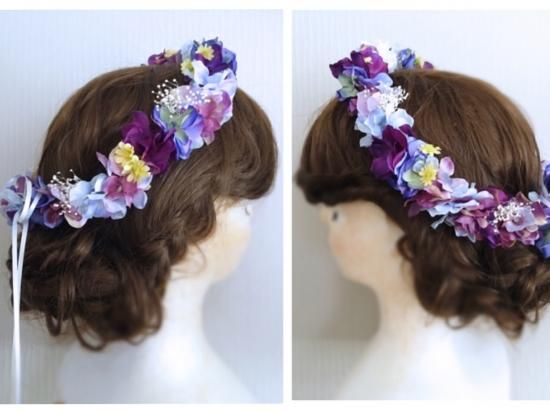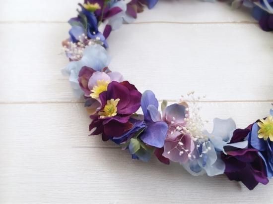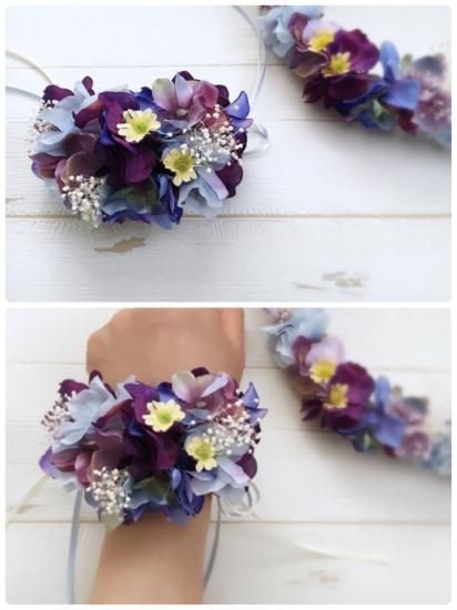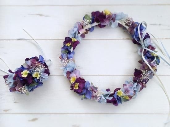 パープルとブルーの組み合わせの中に、小花やプリザーブドのかすみ草を散りばめた花冠&リストレットの2点セットになります。
