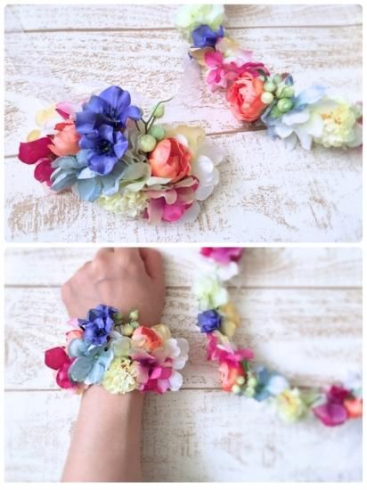 大人カラフルな花冠&リストレット&ブートニア3点セット