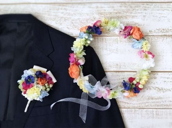 いろんなお花や実を使ってカラフルに仕上げました。カラフルですがどこか大人っぽさもあり、主役を引き立てる可愛らしい花冠&ブートニアの2点セットです。