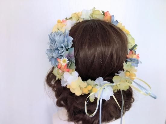 初夏の爽やかさを優しい色あいの水色と黄色でまとめた花冠&リストレット&ブートニアの2点セットです。