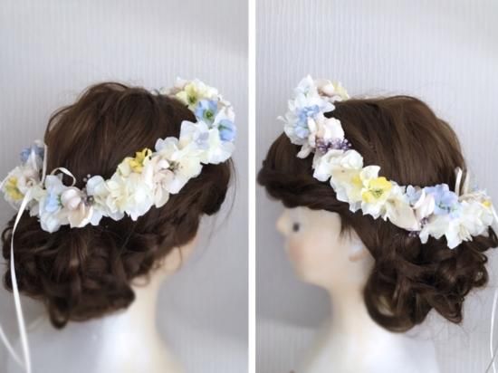 オフホワイトをベースに、淡い黄色や水色を散りばめた、優しく柔らかい雰囲気の花冠&ブートニアの2点セットです。