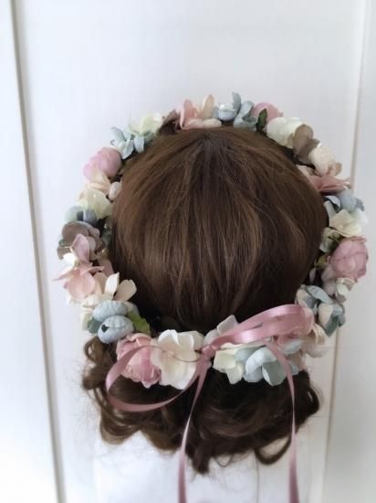 ベージュやアンティークピンク、ブルーグレーなど、グレイッシュなお花を集めたアンティーク感漂う花冠です。