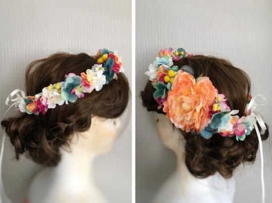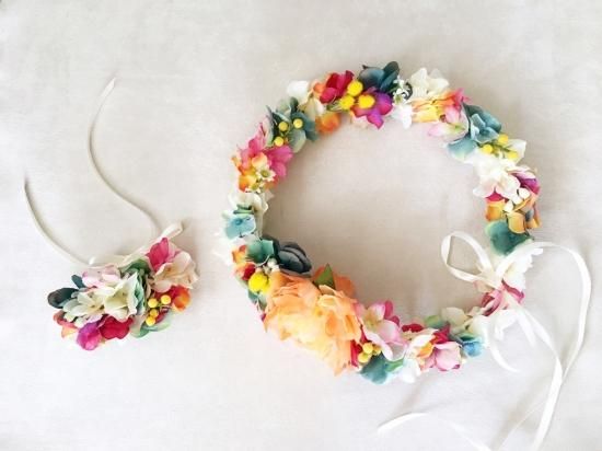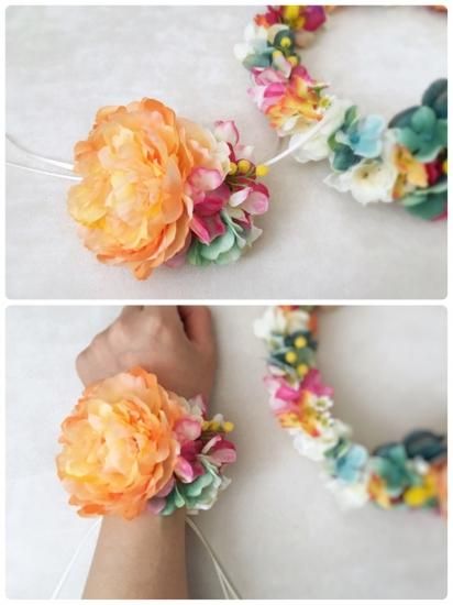 アプリコットオレンジに、ターコイズやチェリーピンクを加えた、海にも映える花冠&リストレットの2点セットになります。
